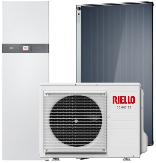 Domus ES Solar is a floor-standing split heat pump system for heating, cooling and domestic water production. The system consists of an outdoor unit in R410A connected through refrigerant pipes to the indoor floor-standing unit.