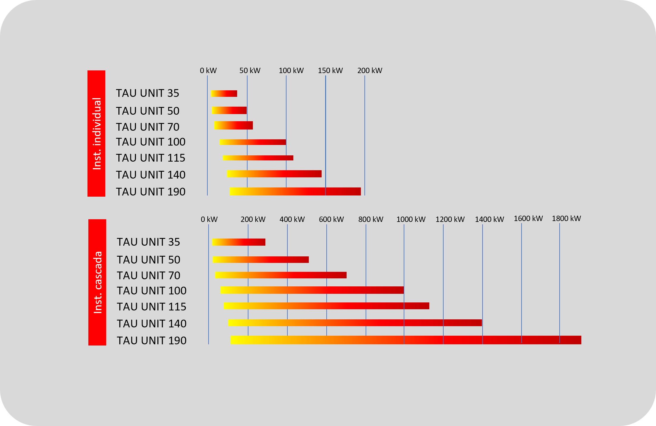 Con TAU UNIT se ofrece una gama de calderas, ya que este se puede instalar tanto en instalaciones individuales (desde 35 hasta 190 kW) como en cascada.