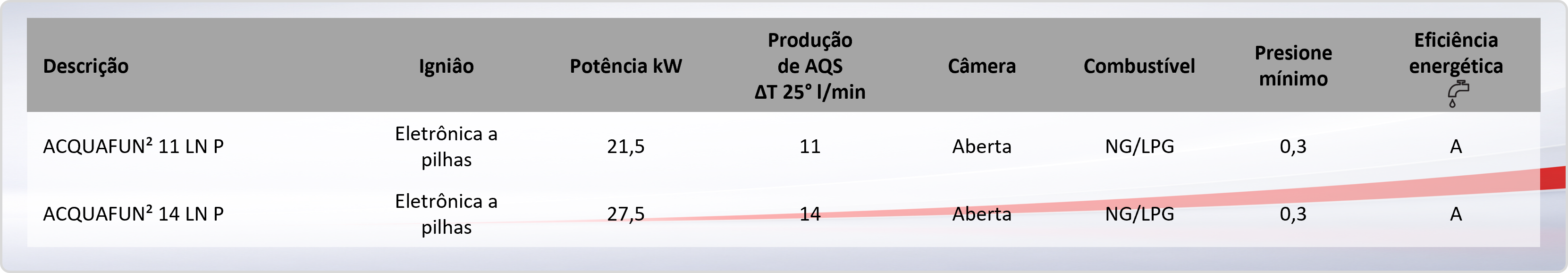ACQUAFUN2 LN P è la scalda acqua instantanea a gas a camera apertada con baixas emissões de NOx disponible en modelos de 11 y 14 litri, si en versión MTN que GPL. As dimensões compatíveis unicamente com a alimentação da bateria tornam o produto fácil e rapidamente instalável.